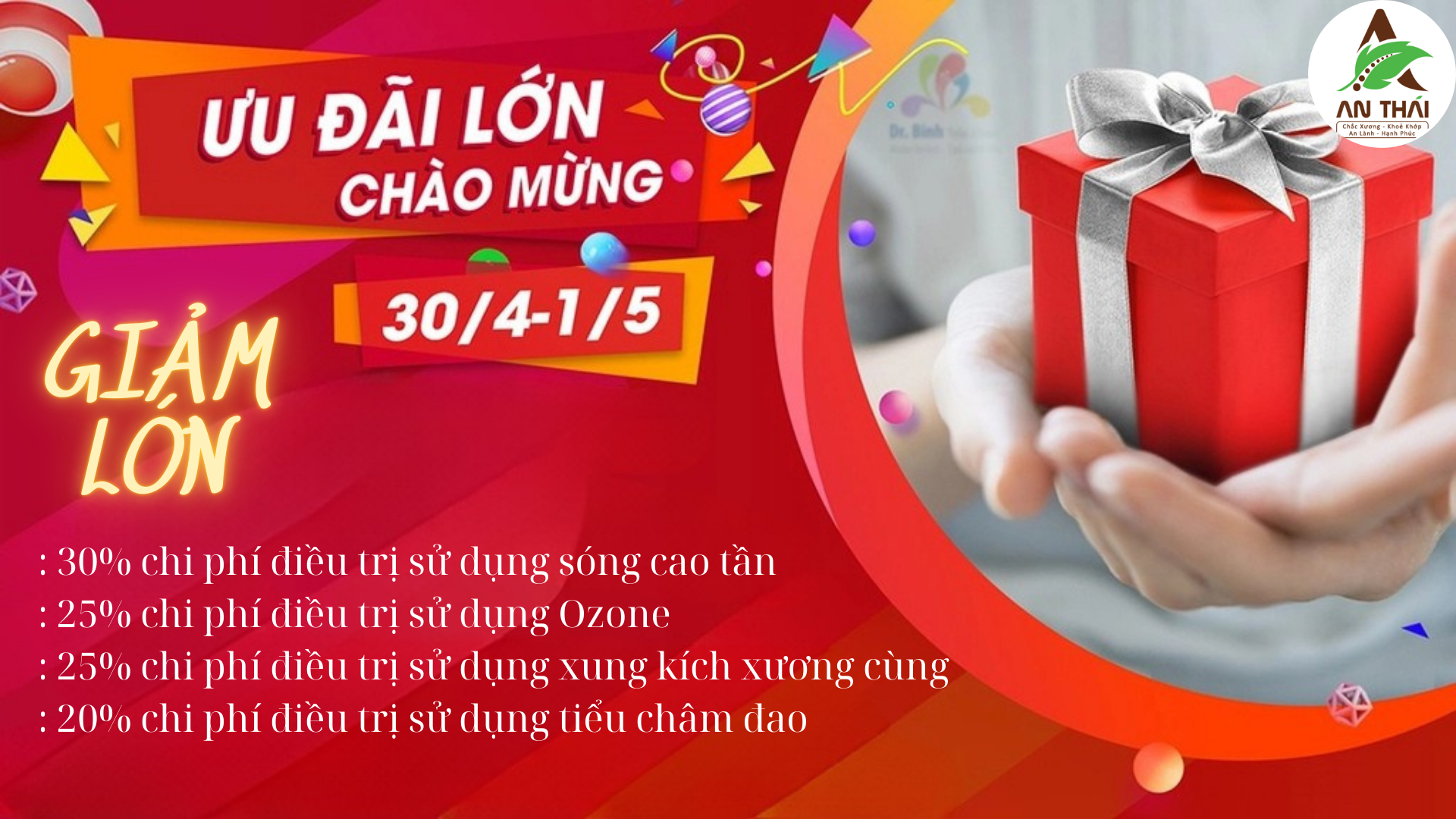 Ưu đãi cực sốc chào mừng ngày Giải Phóng Miền Nam và Quốc Tế Lao Động . Nhân dịp ngày lễ Phòng khám Đông y An Thái xin gửi lời tri ân sâu sắc đến quý bệnh nhân đã tin tưởng và lựa chọn chúng tôi trong suốt thời gian qua. Để thể hiện lòng biết ơn, phòng khám xin dành cho quý khách hàng những ưu đãi hấp dẫn.