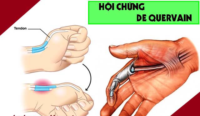 Sưng, nóng, đỏ và đau vùng mỏm trâm xương quay ở cổ tay, đau âm ỉ, liên tục và đau tăng lên khi vận động ngón tay cái, đặc biệt là các động tác dạng và duỗi ngón tay, đau có thể lan theo cơ lên vùng ngoài của cẳng tay.